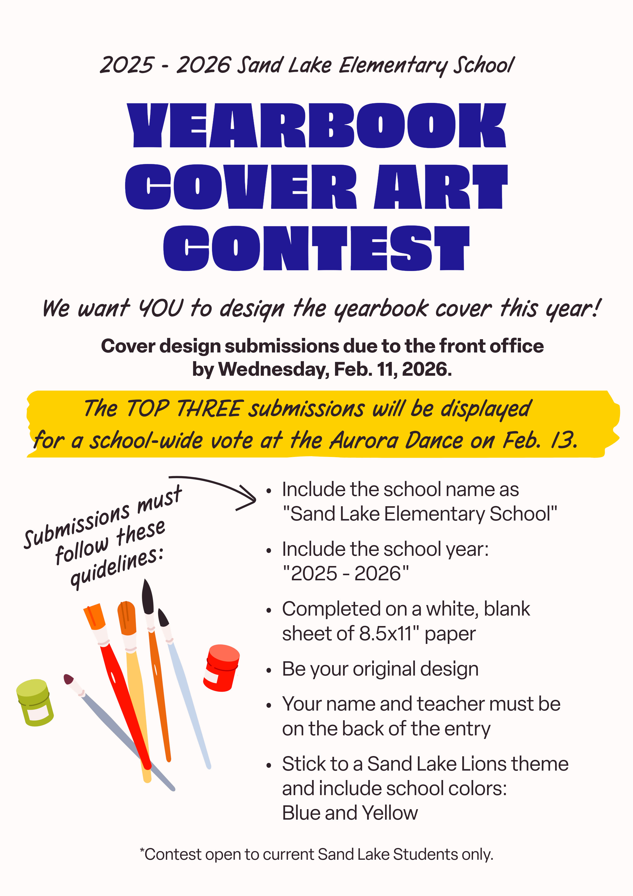 Cover design submissions are due by Feb. 11, 2026. The Top Three submissions will be displayed for a school-wide vote at the Aurora Glow Dance on