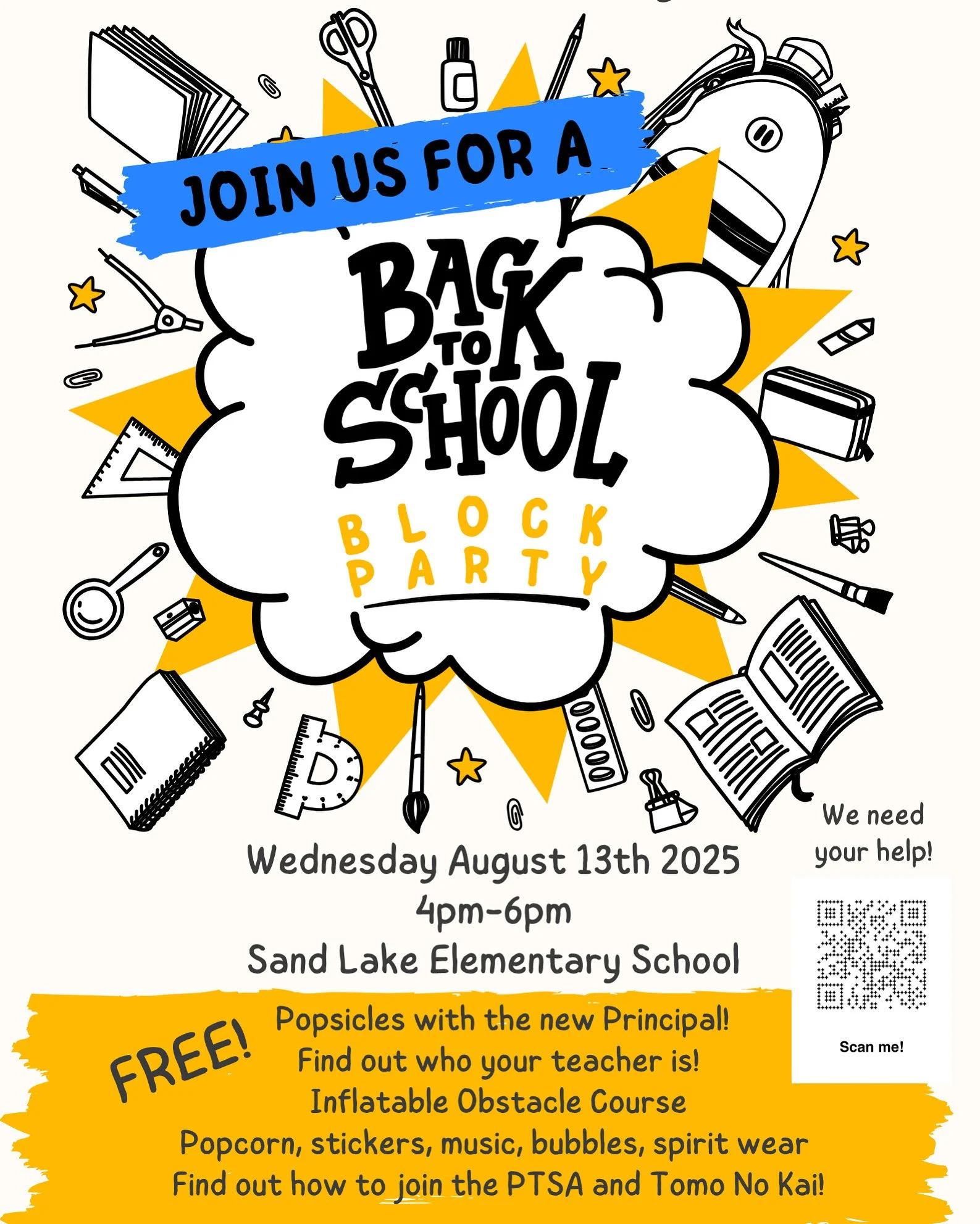 Come meet your teacher and our new principal! Enjoy the inflatable obstacle course, popcorn, bubbles, stickers, free for everyone!